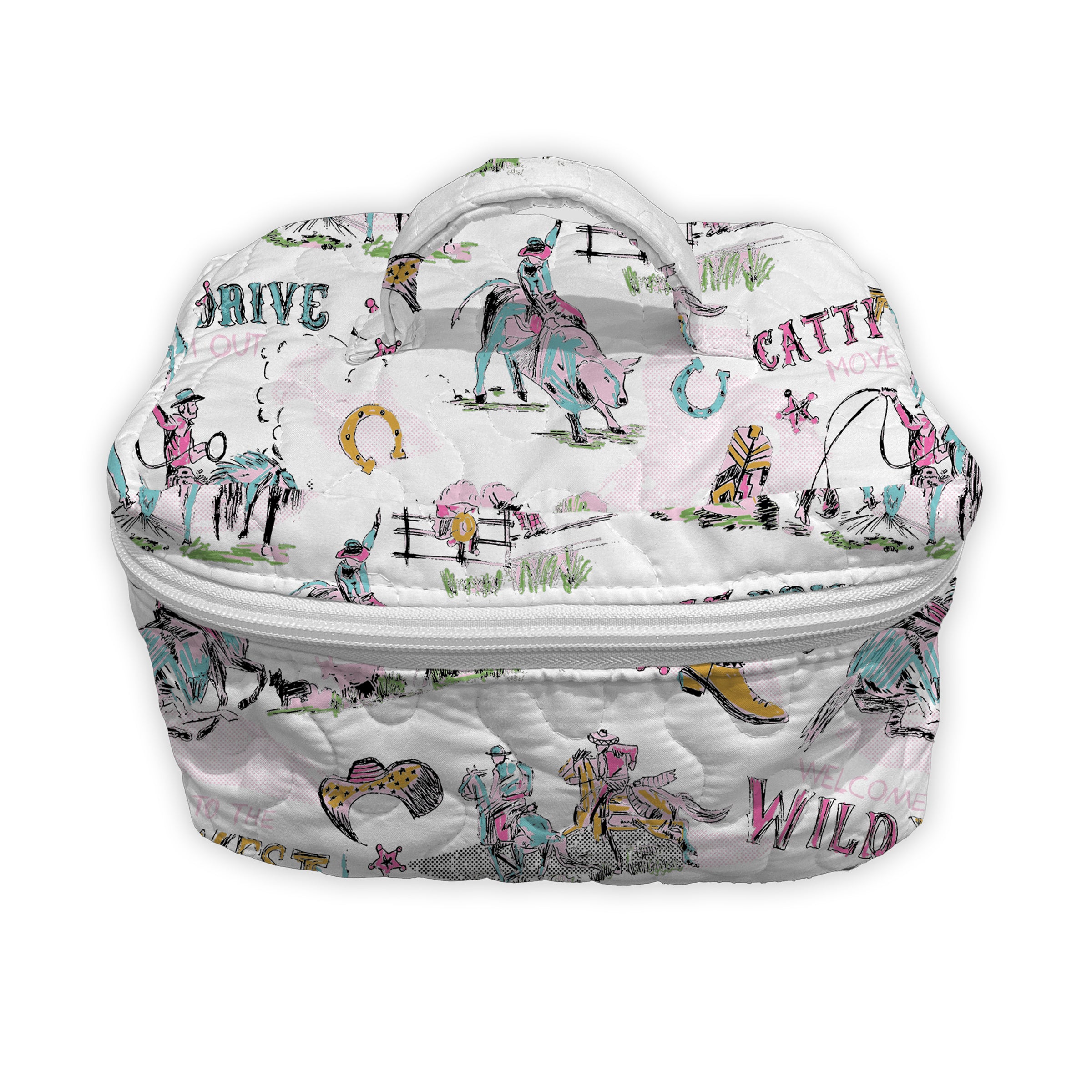 The Cattle Drive Jewels Quilted Travel Case is functionally and thoughtfully designed to keep your essentials organized on the go. This travel bag has a soft quilted exterior, a secure zip closure, and a convenient top handle, it’s ideal for storing makeup, toiletries, tech accessories, or anything you need within easy reach. Machine washable, too, so you don’t have to fuss none, just a little care, and it’ll last you for years.