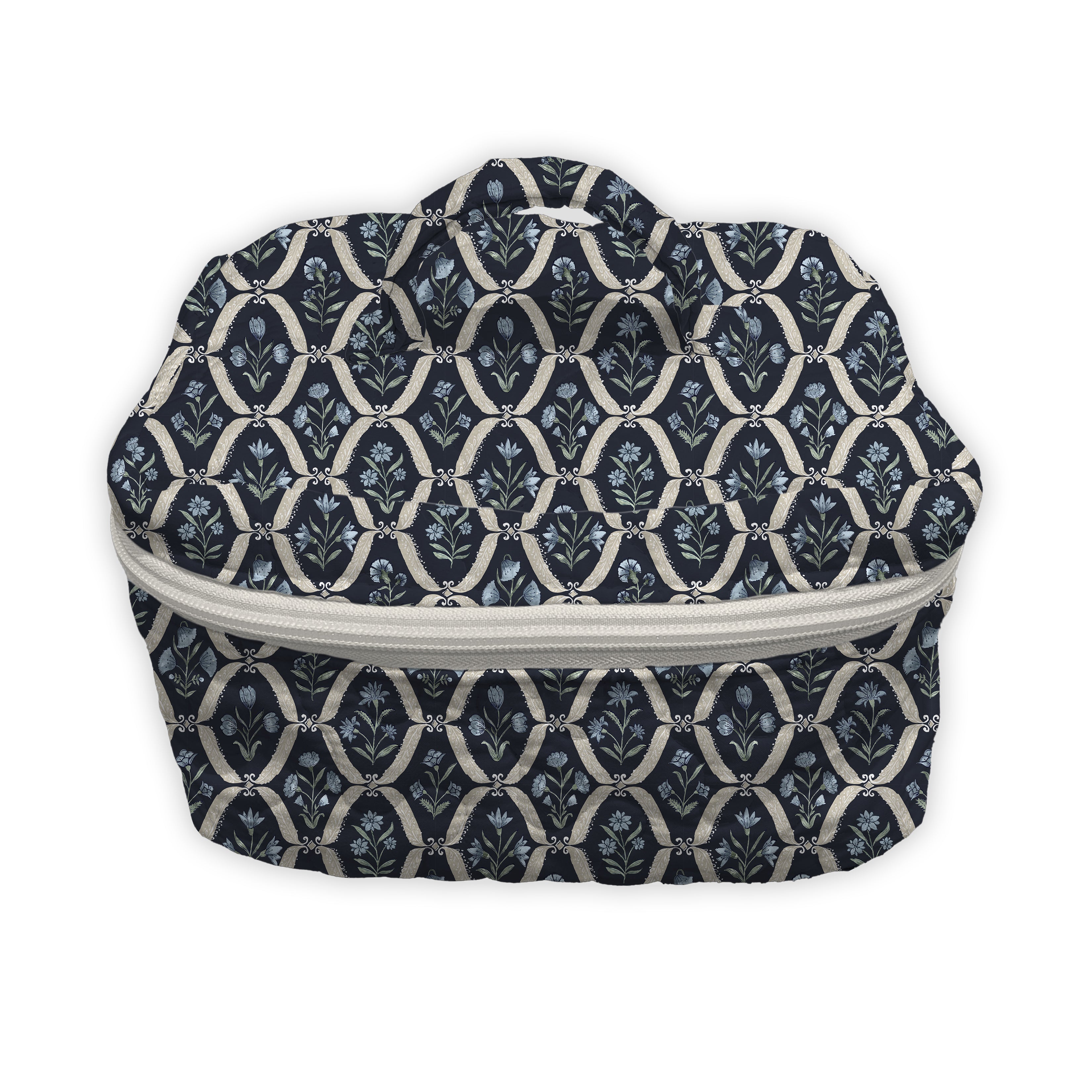 The Charlotte Navy Quilted Travel Case has a soft quilted exterior, a secure zip closure, and a convenient top handle, it’s ideal for storing makeup, toiletries, tech accessories, or anything you need within easy reach. Machine washable, too, so you don’t have to fuss none, just a little care, and it’ll last you for years.