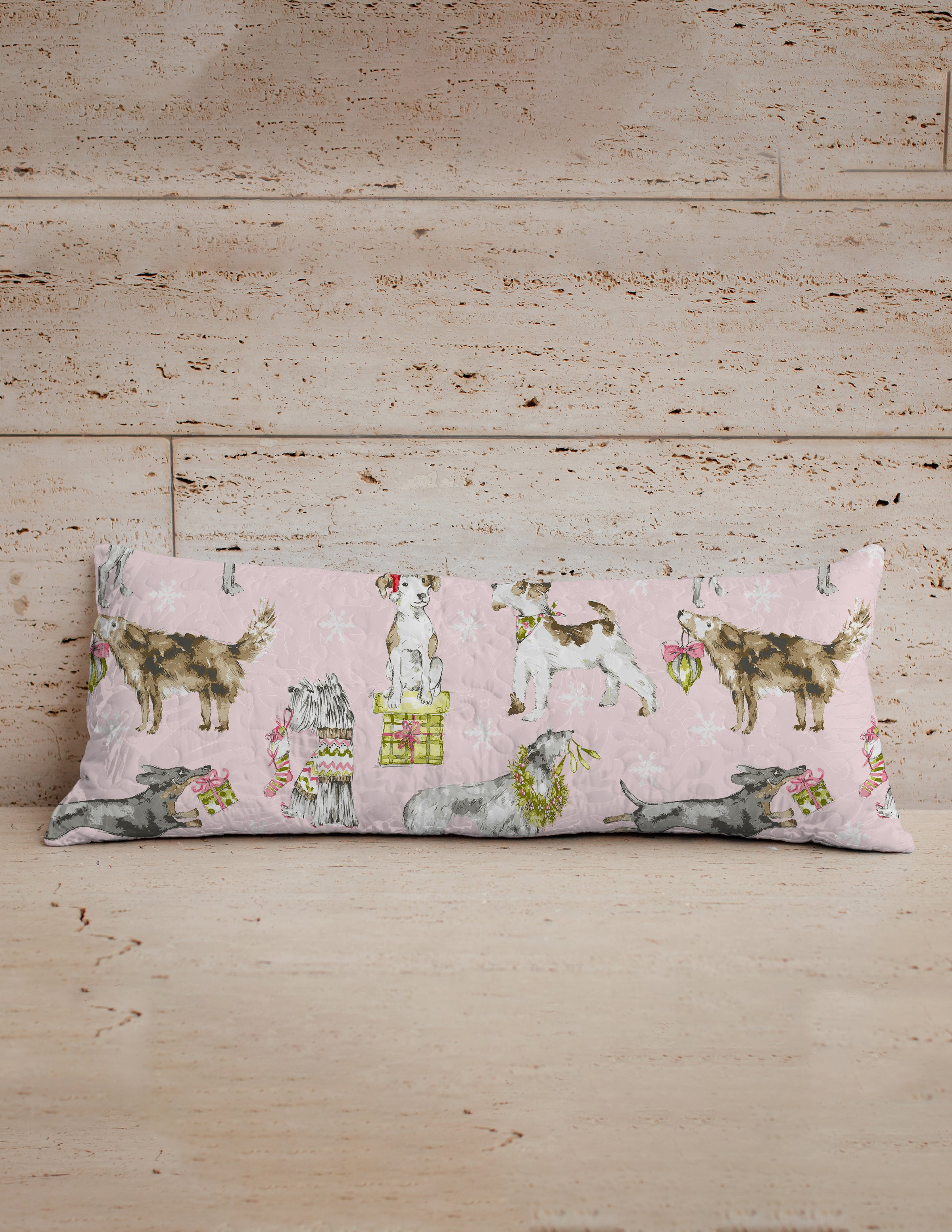 Christmas Pups Pink Quilted Oblong 14" x33" Pillow