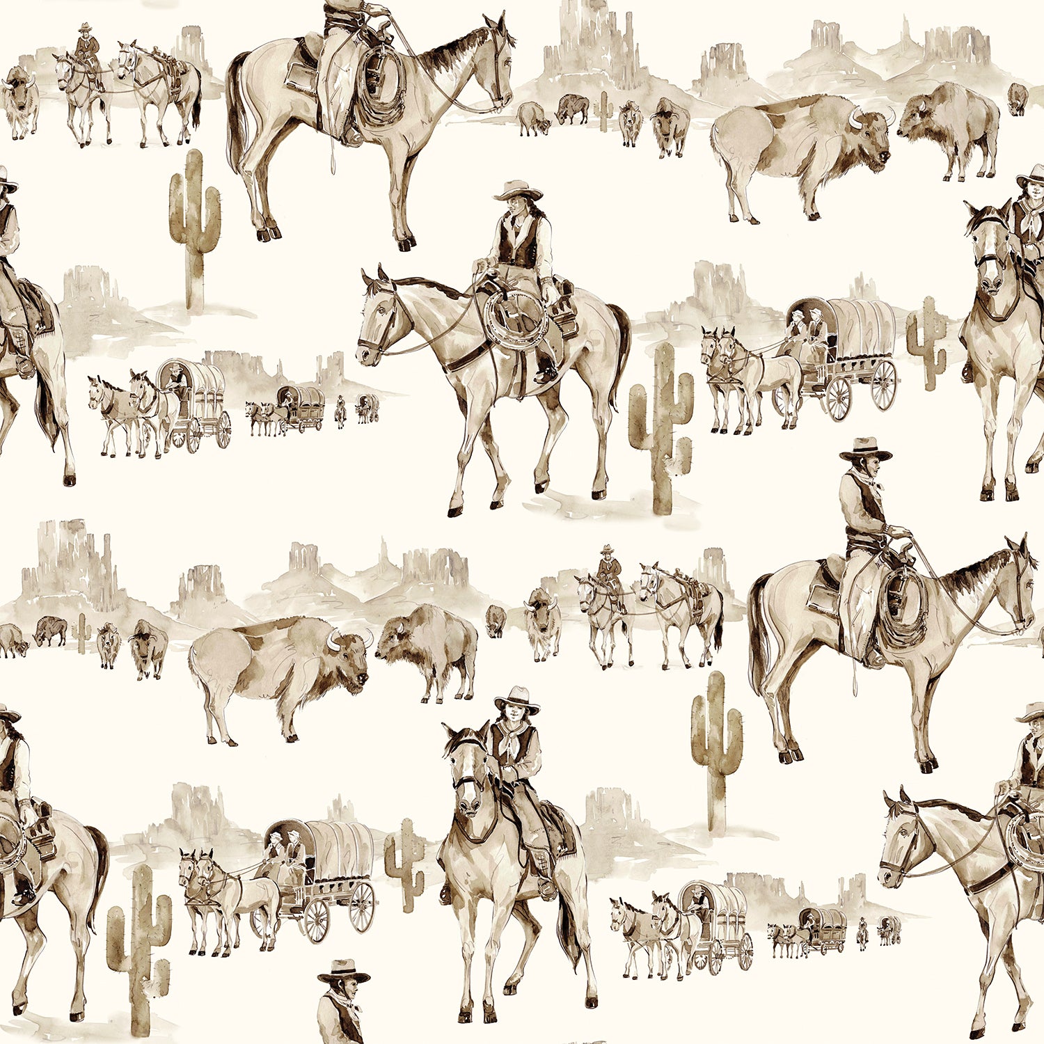 Linen background with cowgirl and cactus motif.