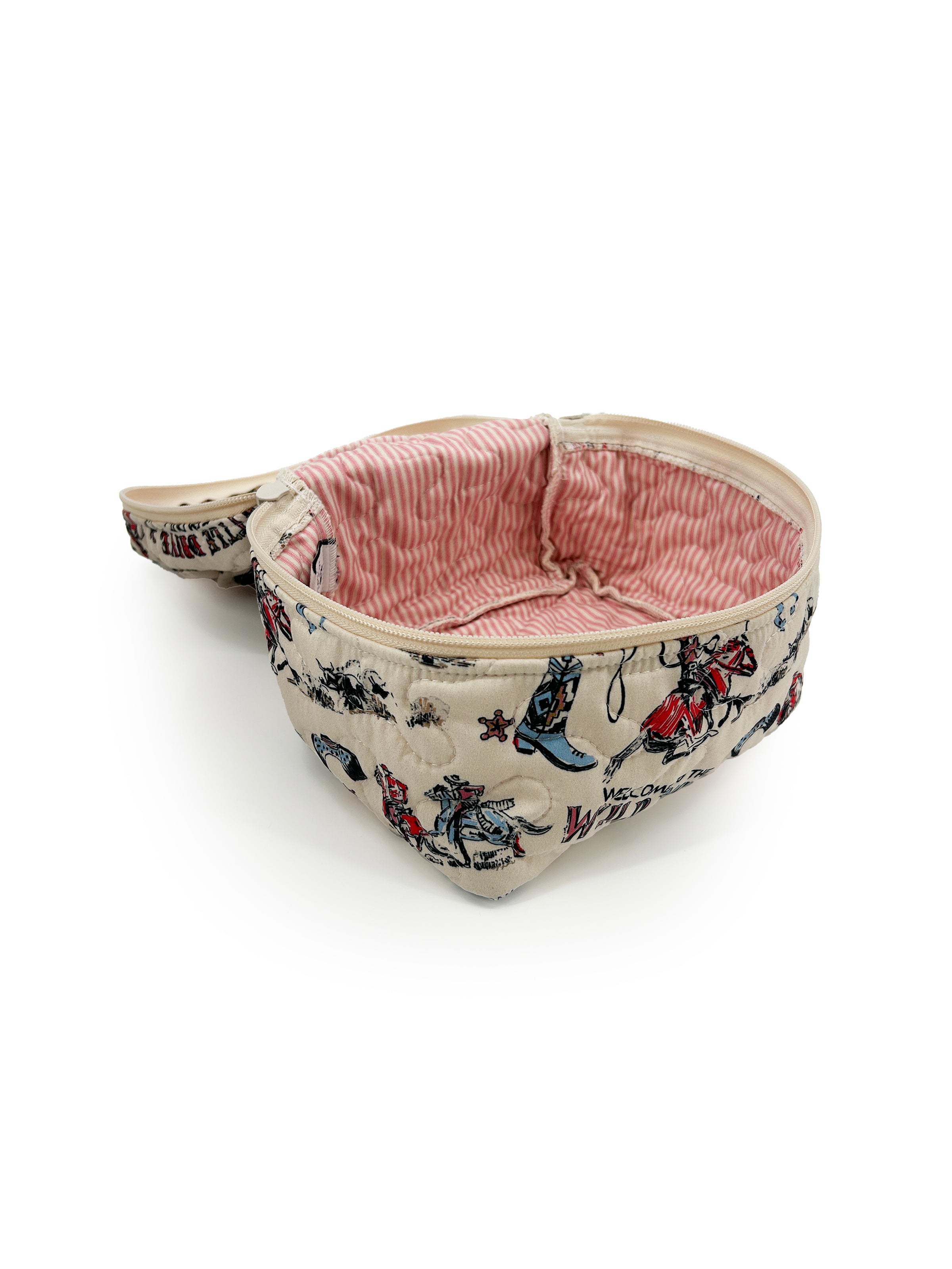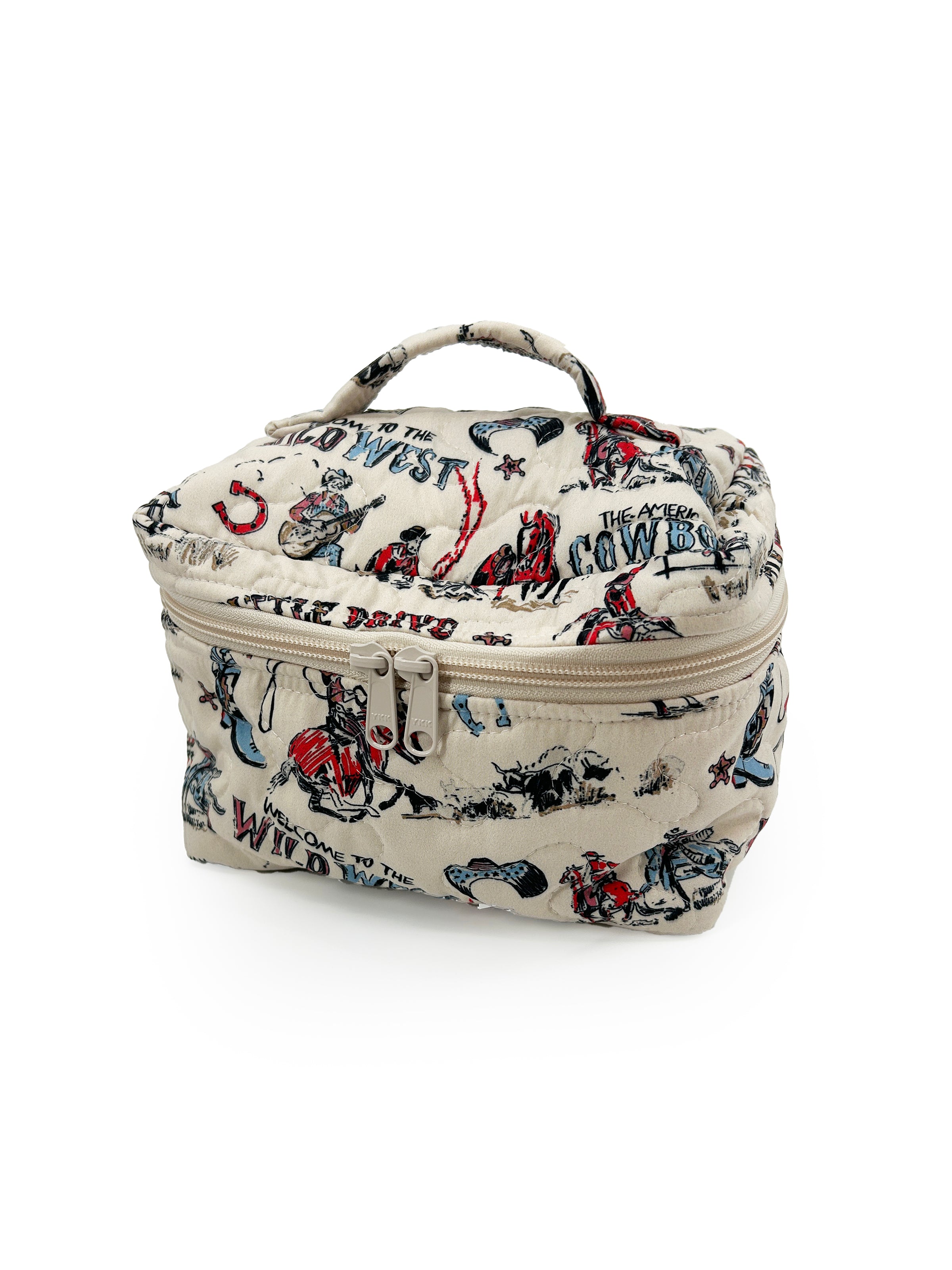 The Cattle Drive Sand Quilted Travel Case is functionally and thoughtfully designed to keep your essentials organized on the go. This travel bag has a soft quilted exterior, a secure zip closure, and a convenient top handle, it’s ideal for storing makeup, toiletries, tech accessories, or anything you need within easy reach. Machine washable, too, so you don’t have to fuss none, just a little care, and it’ll last you for years.