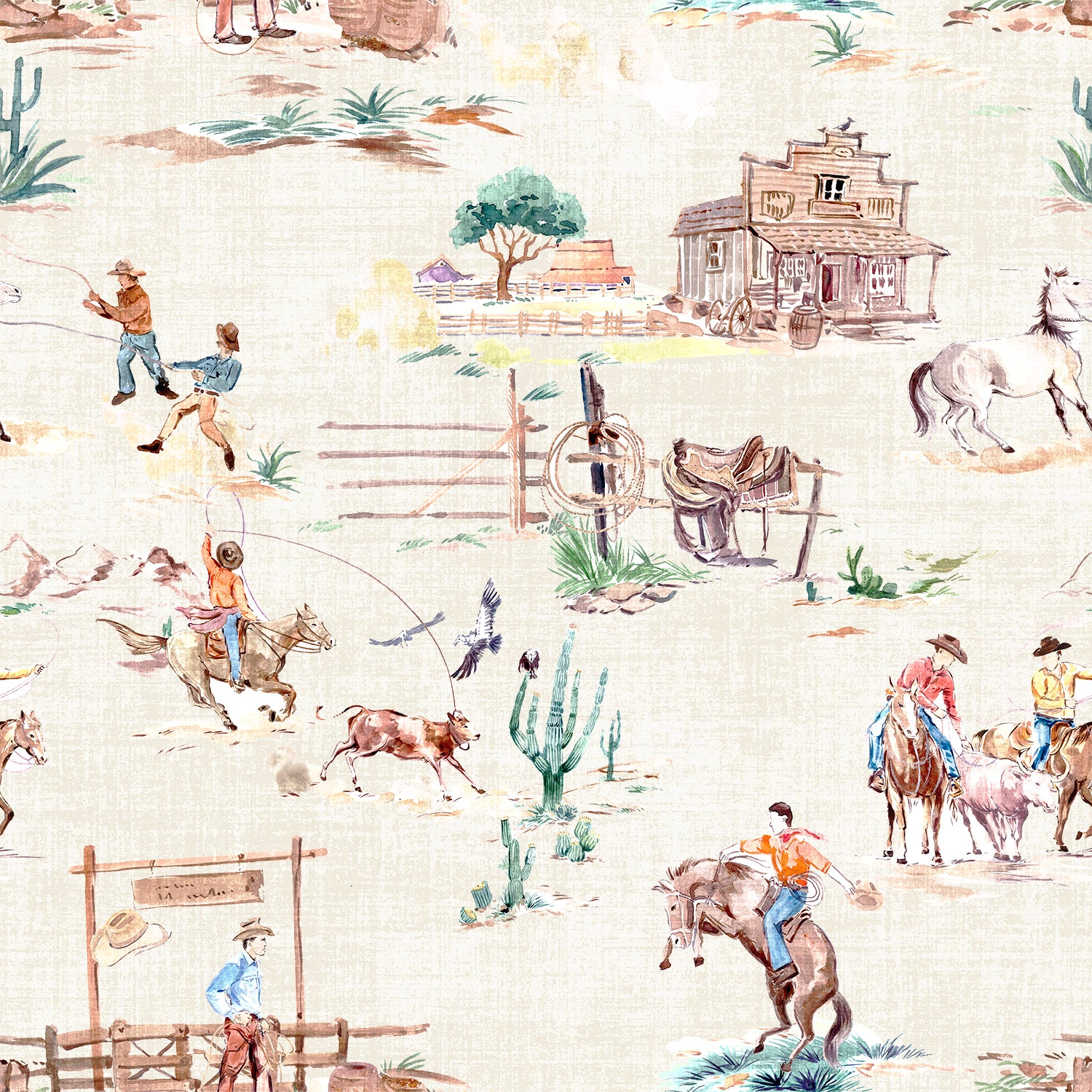 Cream background with cowboy motif.