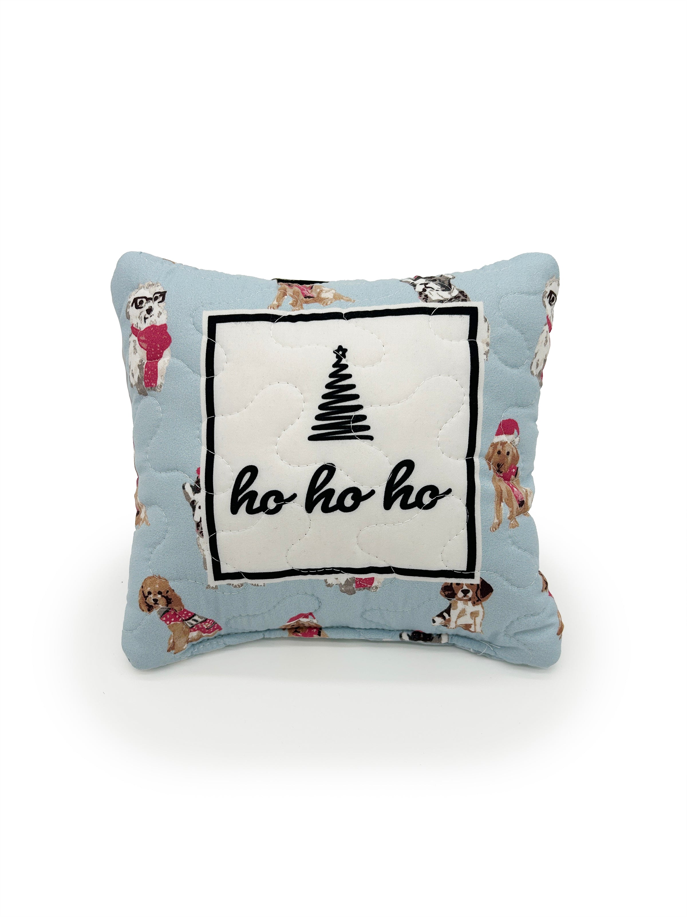 "Ho Ho Ho" Sweater Pups Blue Quilted Mini Pillow 8" x 8"