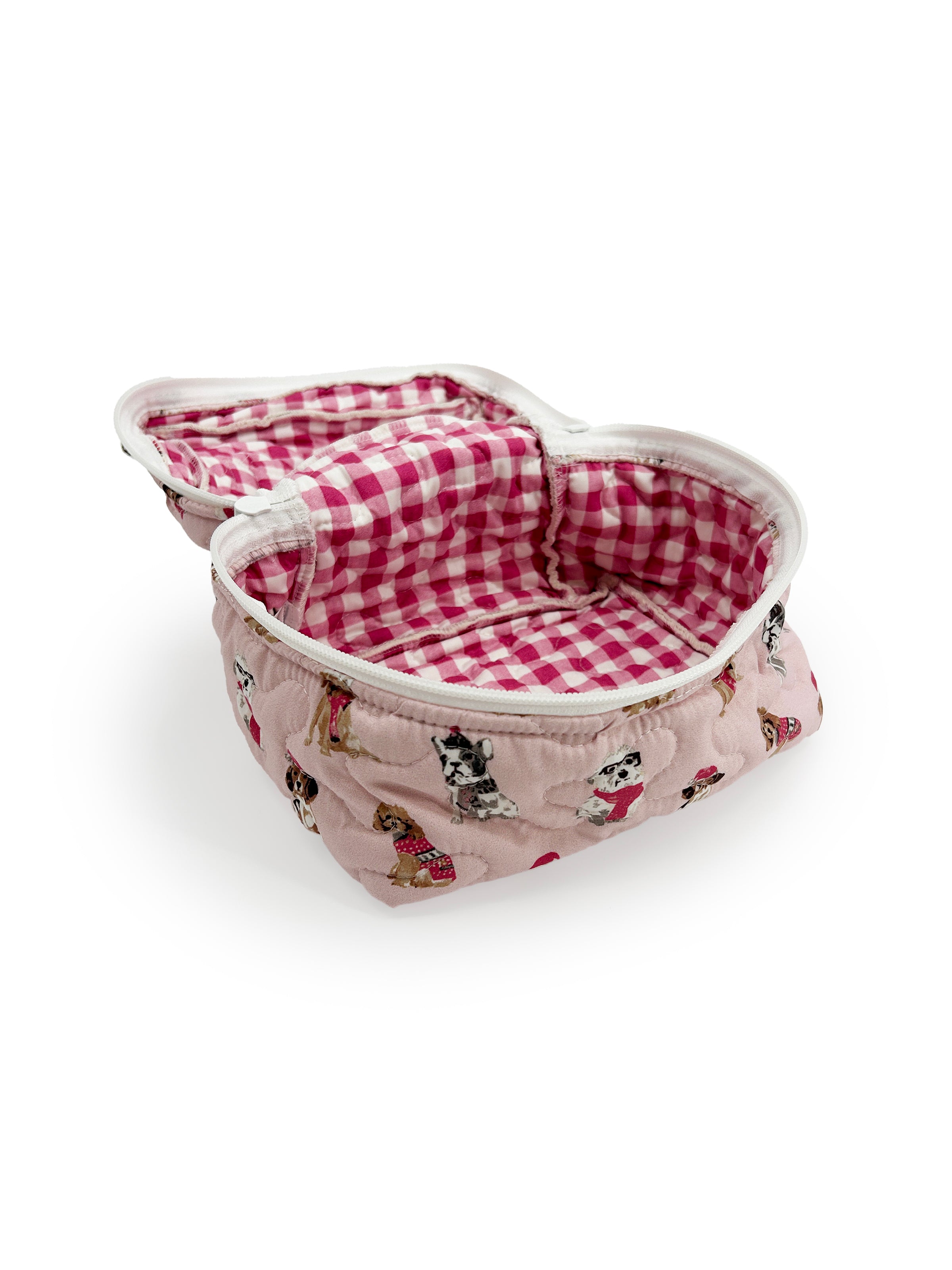 The Sweater Pups Pink Quilted Travel Case is functionally and thoughtfully designed to keep your essentials organized on the go. This travel bag has a soft quilted exterior, a secure zip closure, and a convenient top handle, it’s ideal for storing makeup, toiletries, tech accessories, or anything you need within easy reach. Machine washable, too, so you don’t have to fuss none, just a little care, and it’ll last you for years.