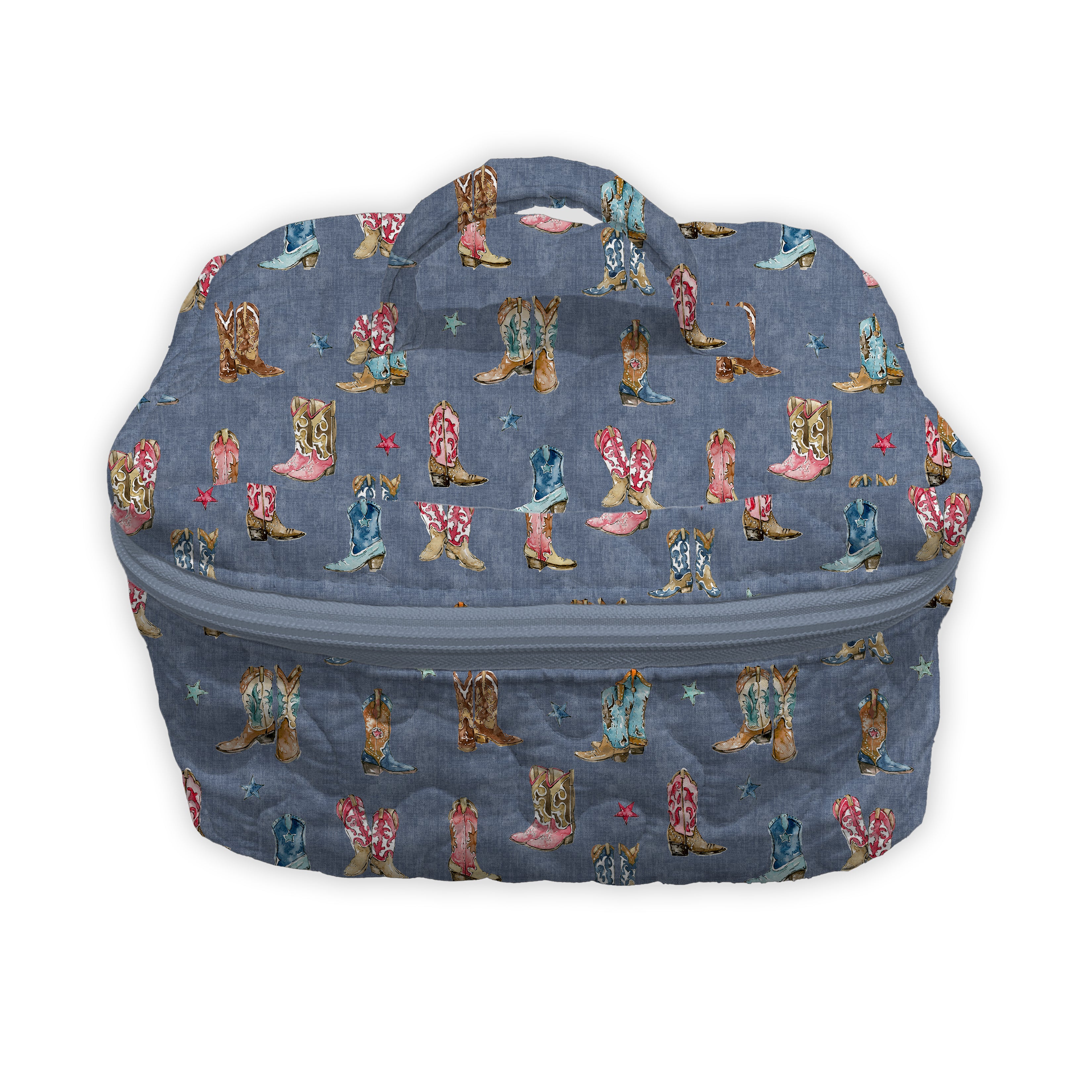 The Thunderbird Boots Chambray Quilted Travel Case is one of those pieces you’ll keep for years, the kind your grandma would’ve packed for a weekend away and still have sitting pretty on her vanity. Made to travel gracefully, it keeps your makeup and little necessities tucked neatly in one place, so you’re never digging or rushing. The soft quilted chambray feels timeless, like something stitched with care, and it carries a touch of that Thunderbird heritage with every mile. Practical, pretty, and made to last, just the way things ought to be. Machine washable, too, so you don’t have to fuss none, just a little care, and it’ll last you for years.