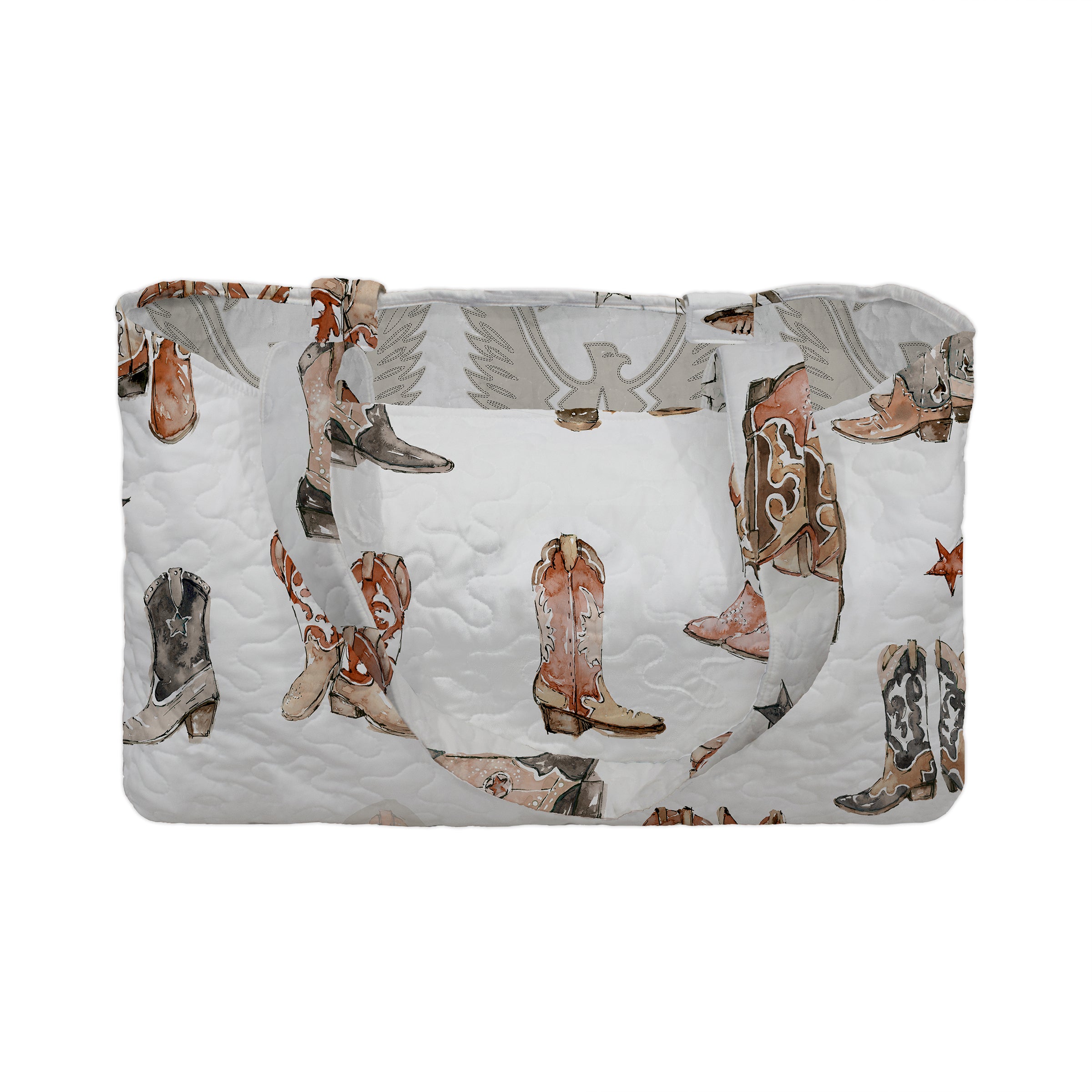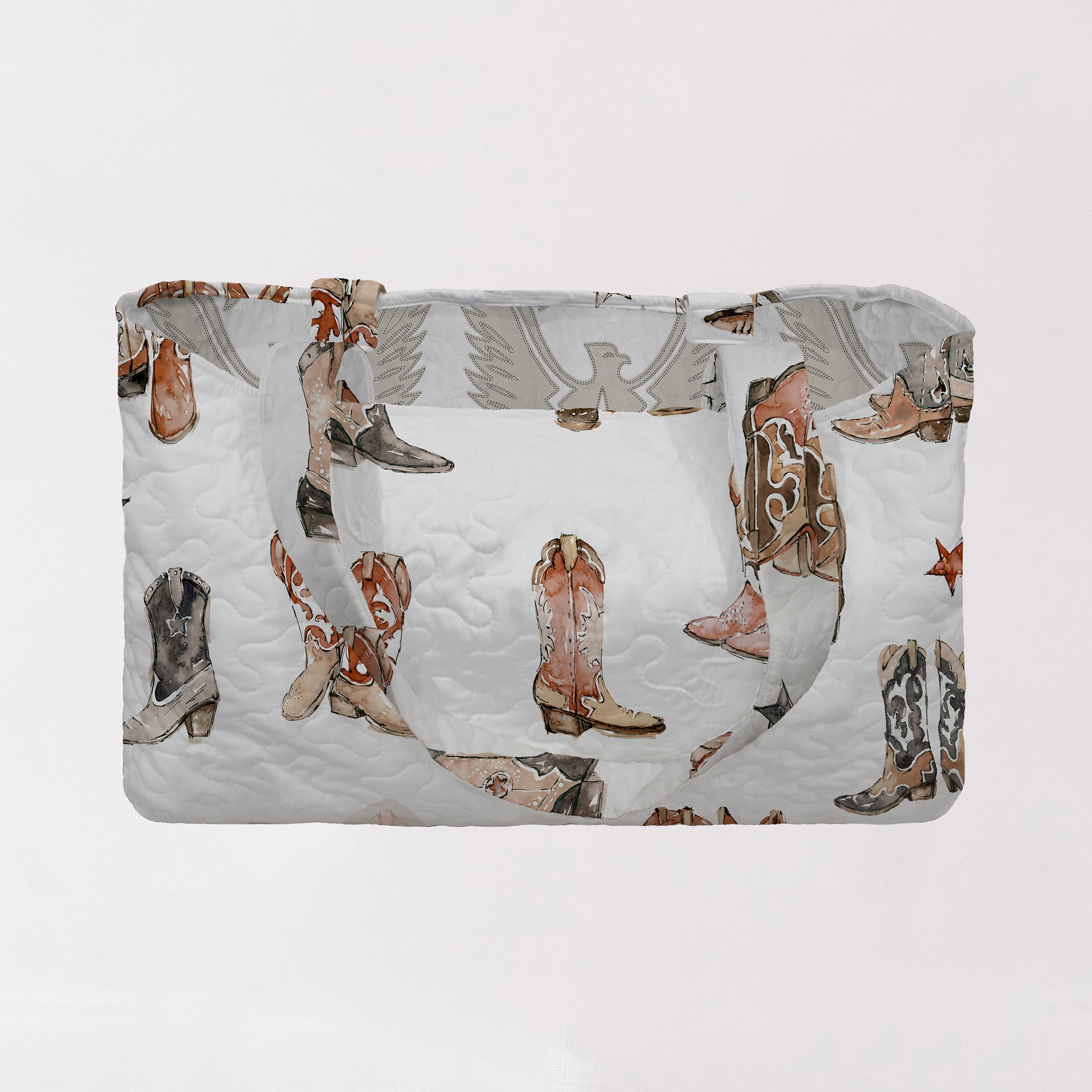 Discover our versatile and fashionable quilted tote, proudly made in Fort Worth, Texas. Crafted with care and designed for your busy life, the Thunderbird Boots Quilted Tote is not only a fashion statement but also a functional accessory. With the convenience of being machine washable on cold, it's a bag that can keep up with your everyday adventures. Explore our collection and experience the perfect blend of Texan craftsmanship and easy care. Elevate your style, and simplify your life with the Thunderbird Boots Quilted Tote.