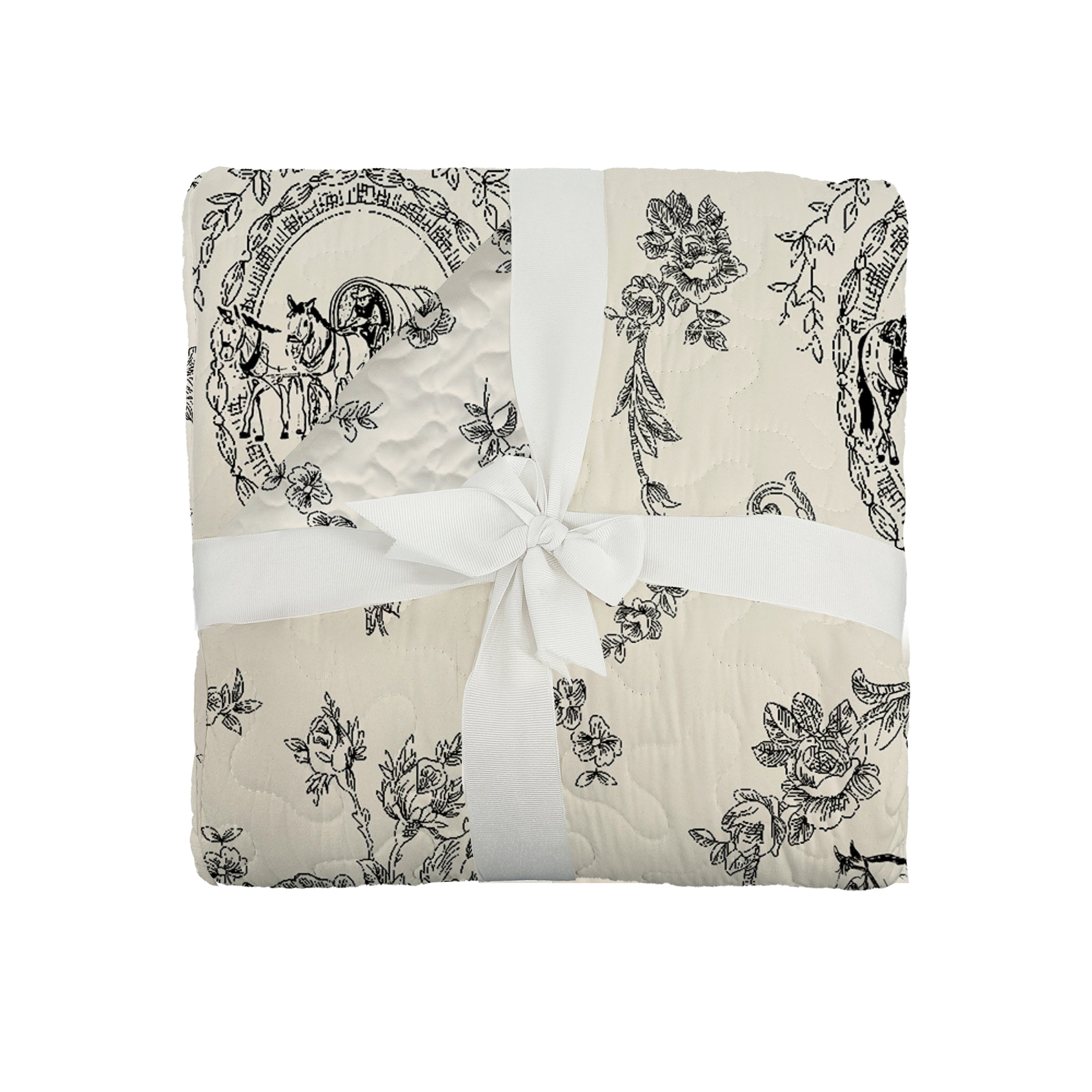 - Sandy beige background with an equestrian cameo framed by ornate medallions and delicate floral detailing toile.
